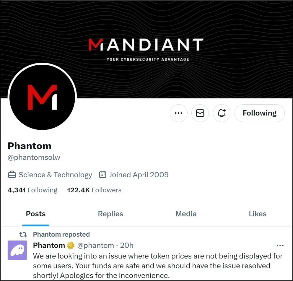 Cybersecurity giant Mandiant, a subsidiary of Google, faced an ironic twist today when its Twitter account was compromised. The attackers swiftly transformed it into @phantomsolw, masquerading as the Phantom crypto wallet. Their agenda? Promoting a fraudulent website offering free $PHNTM tokens in a classic airdrop scam.